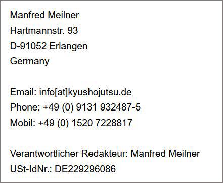 ImpressumManfred MeilnerHartmannstr. 93D-91052 ErlangenGermanyEmail: info[at]kyushojutsu.dePhone: +49 (0) 9131 932487-5Mobil: +49 (0) 1520 7228817Verantwortlicher Redakteur: Manfred Meilner USt-IdNr.: DE229296086